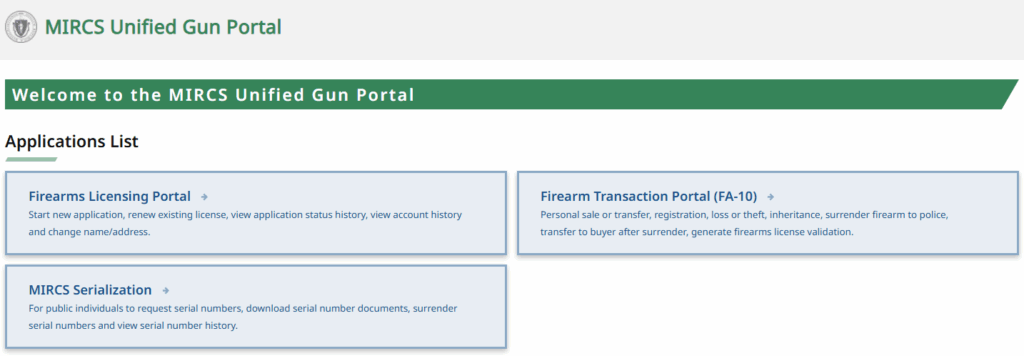 The MIRCS UNIFIED GUN PORTAL is Massachusetts’ new online system for all firearms-related services, including applying for new/renewing existing licenses.