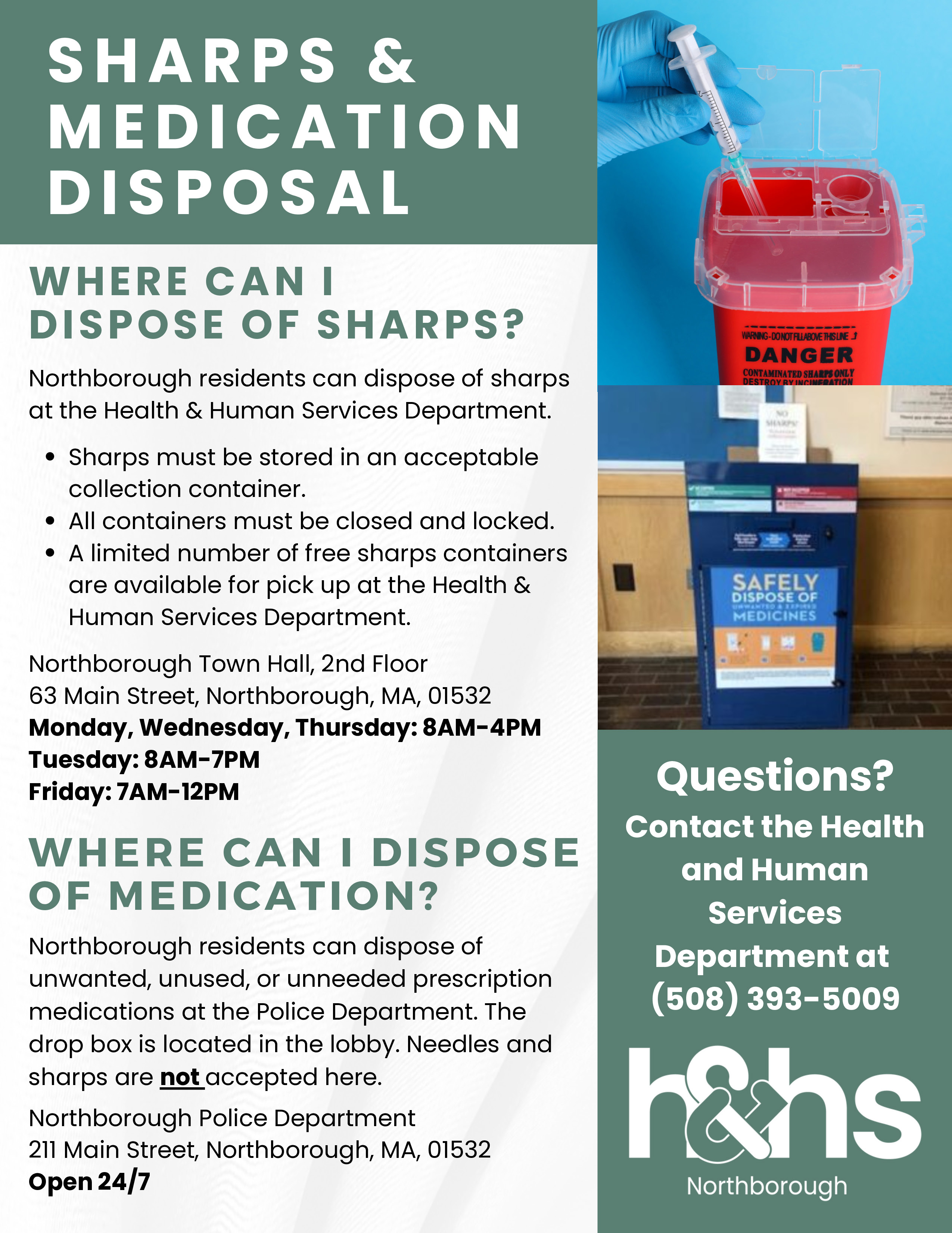 The drop box is located in the department lobby. Needles / sharps are not accepted here. Northborough residents can dispose of sharps at the Health & Human Services Department at Town Hall during regular business hours.