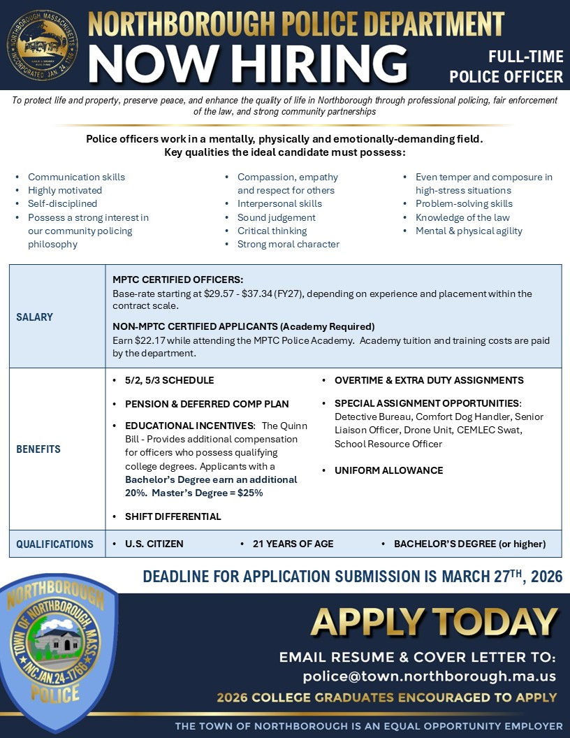 The current Collective Bargaining Agreement and further information about the benefits offered by the Town of Northborough can be found here.